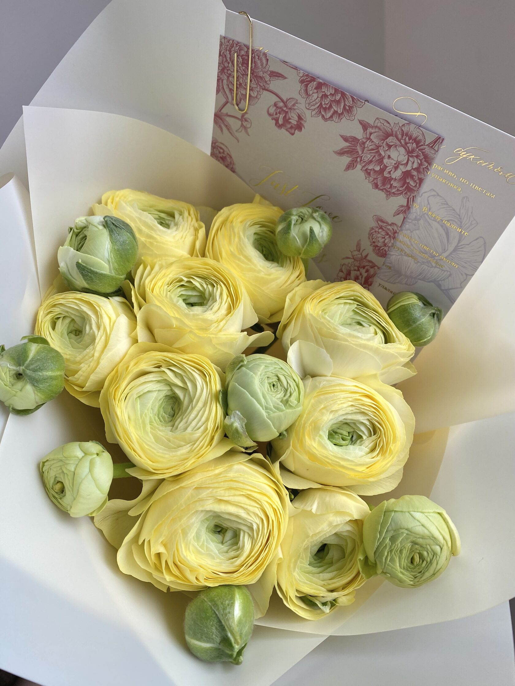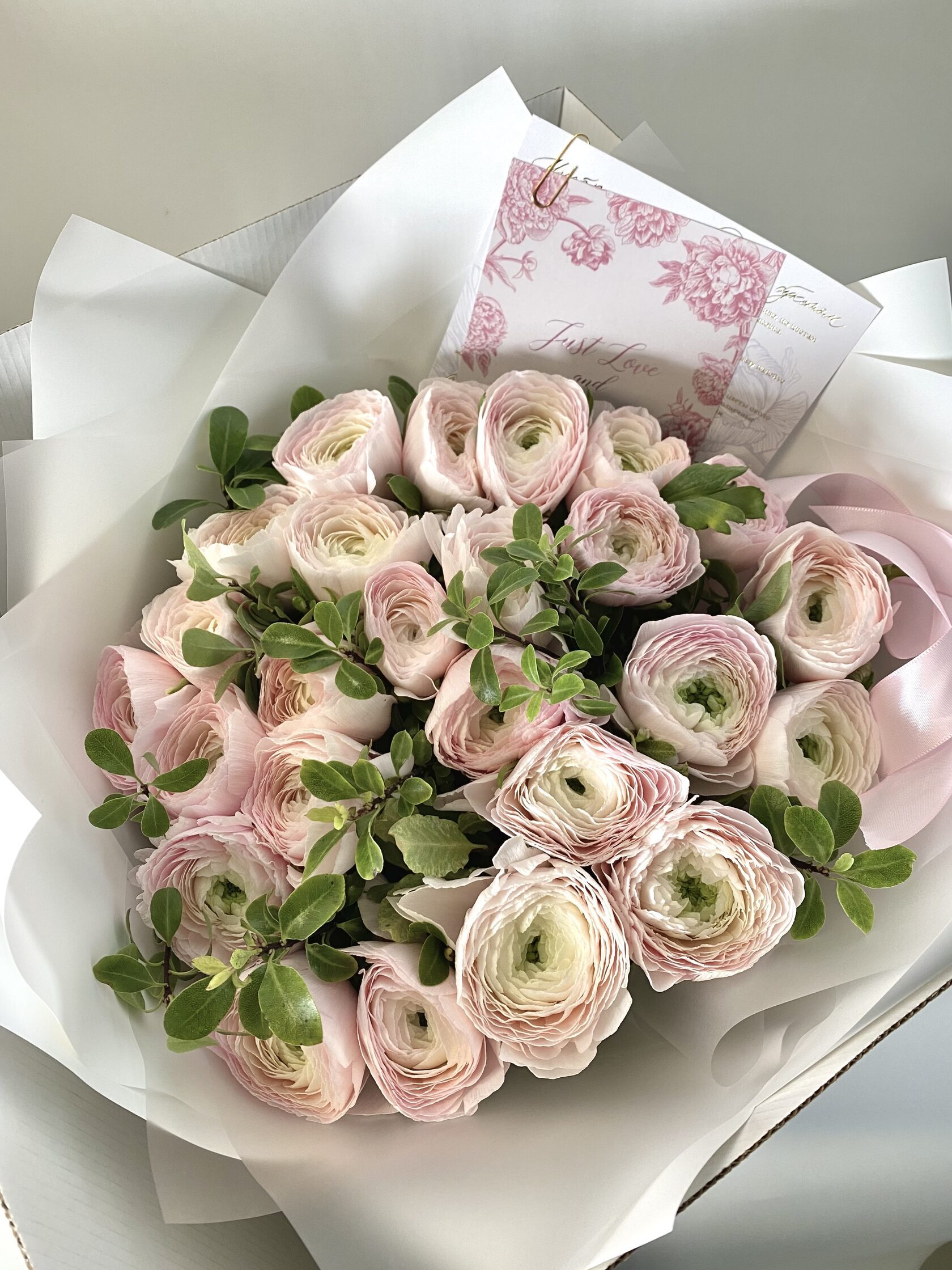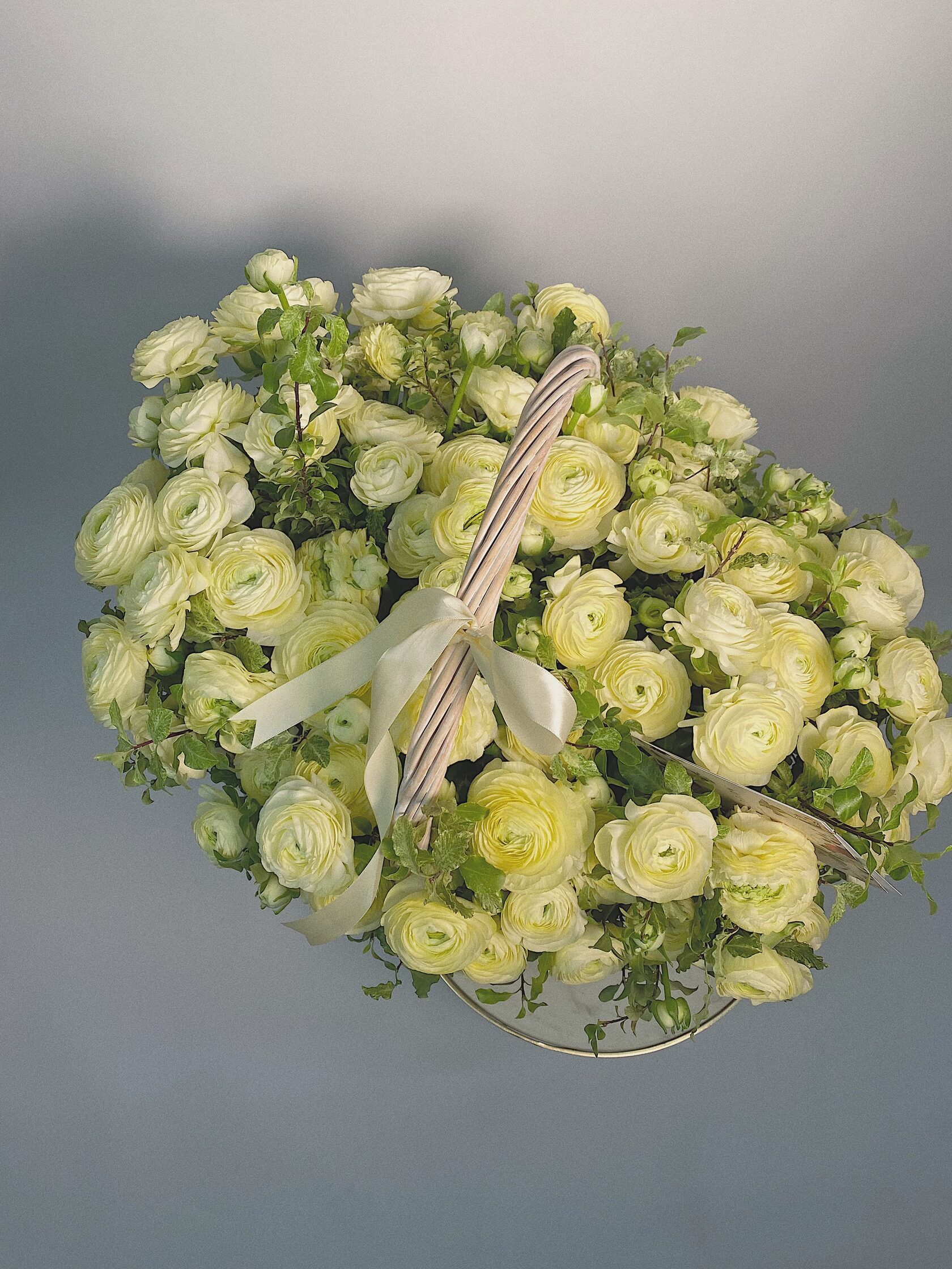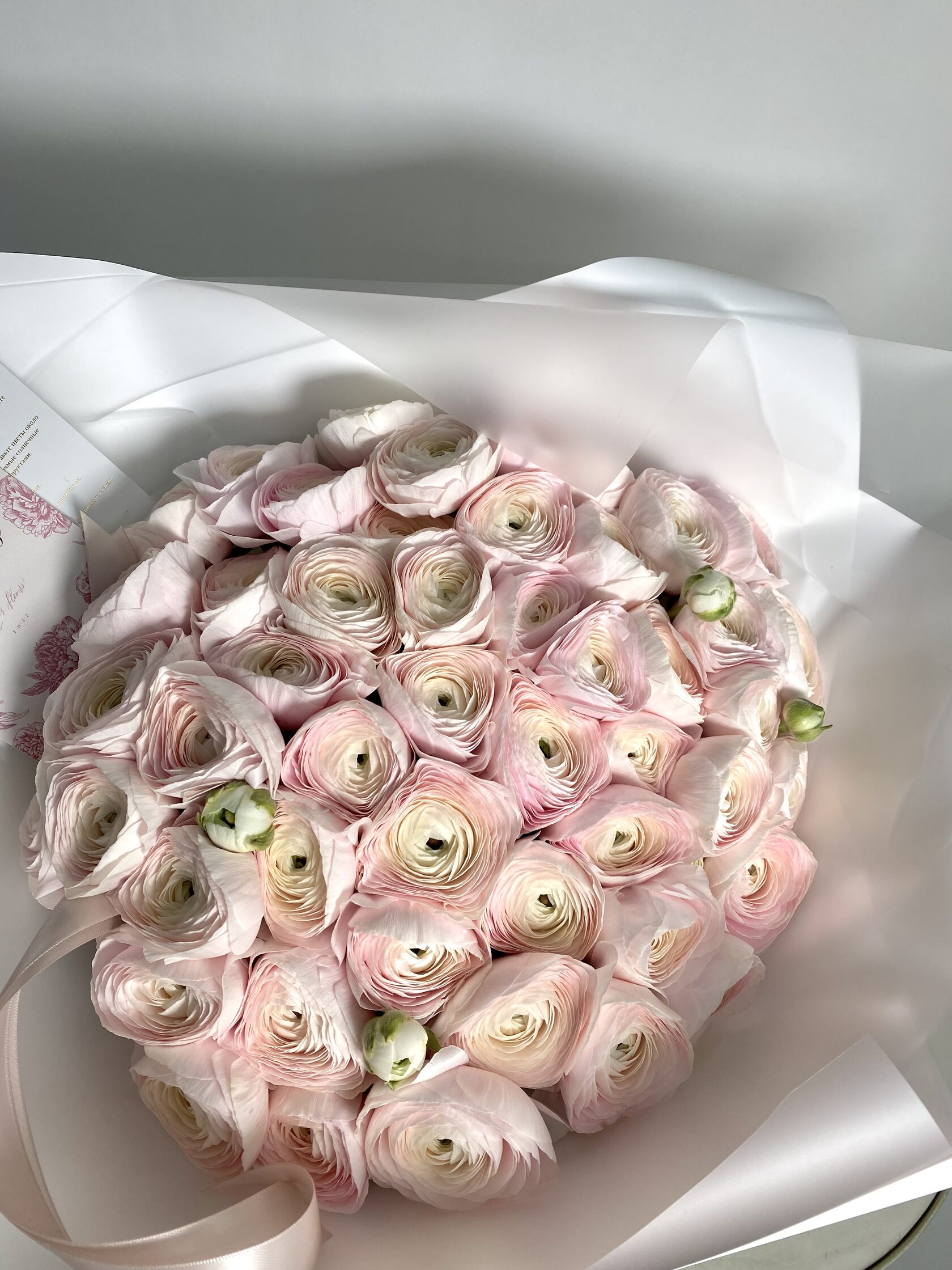 Часто для подарочных композиций выбирают нежные ранункулюсы - это цветы с округлыми бутонами из тонких невесомых лепестков.