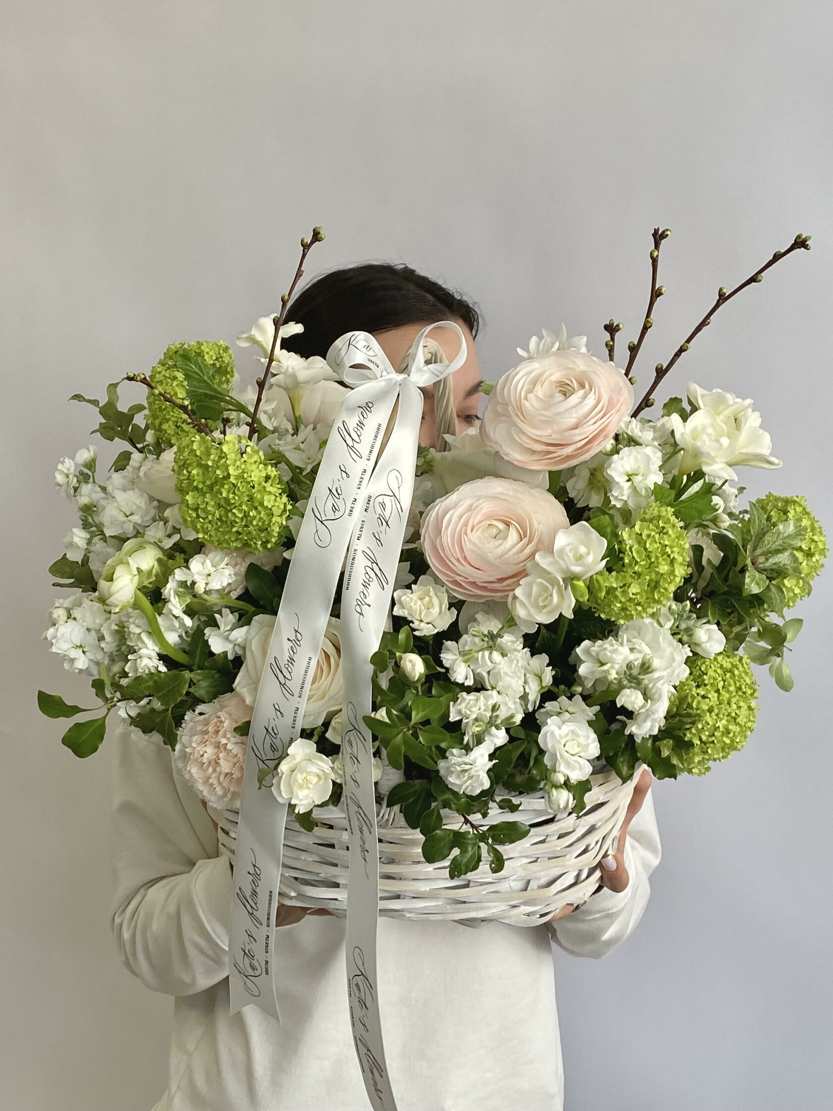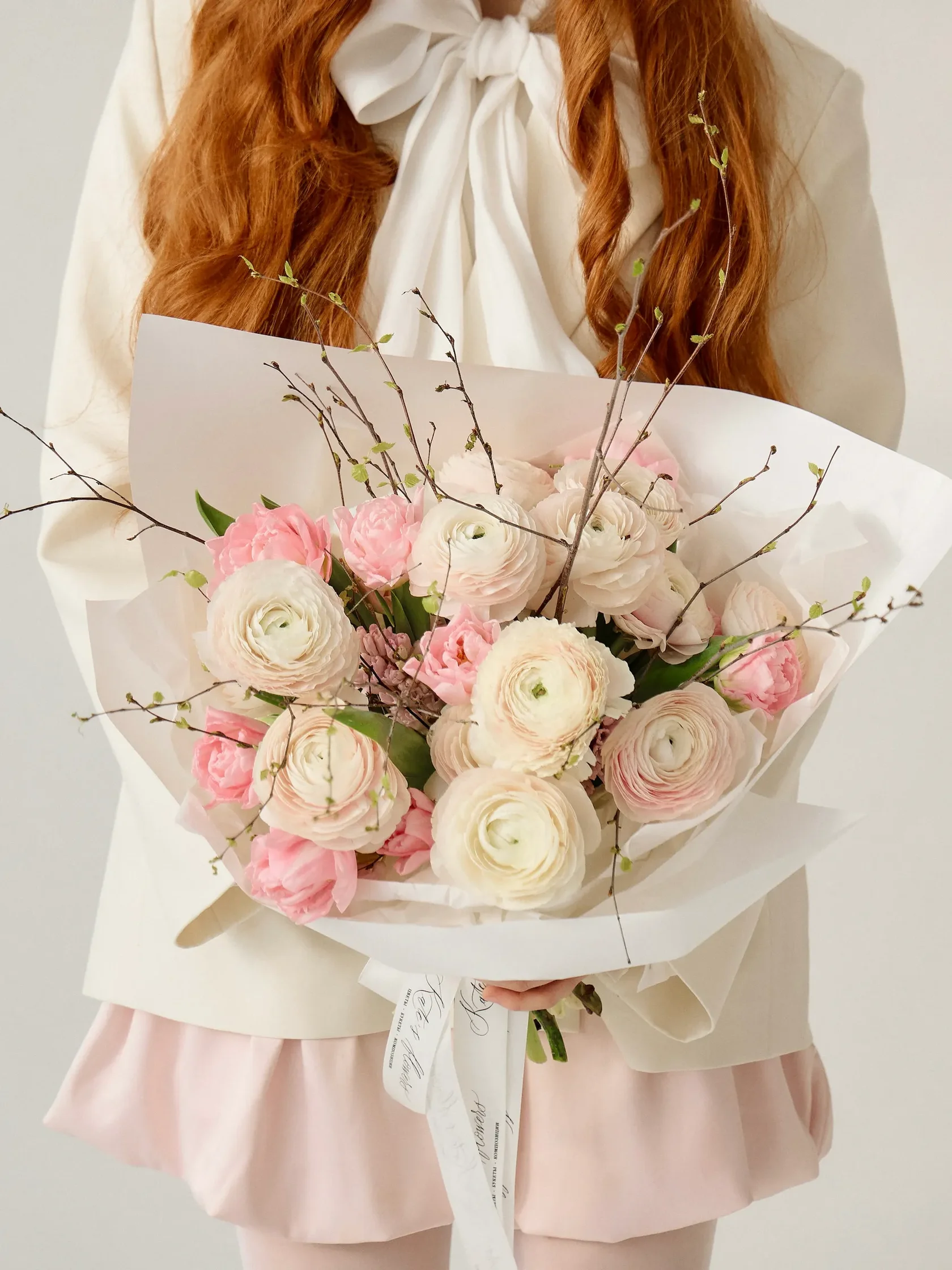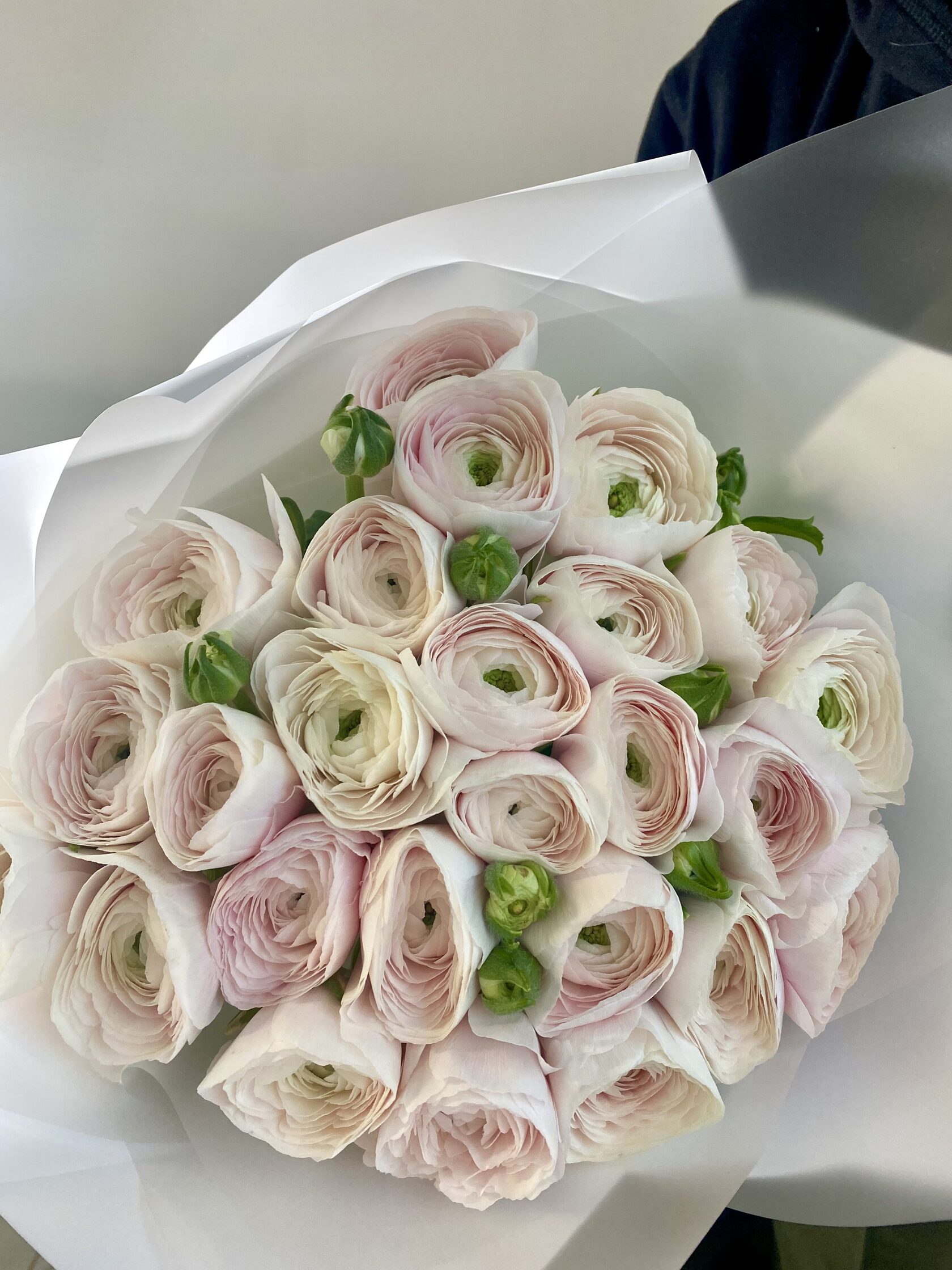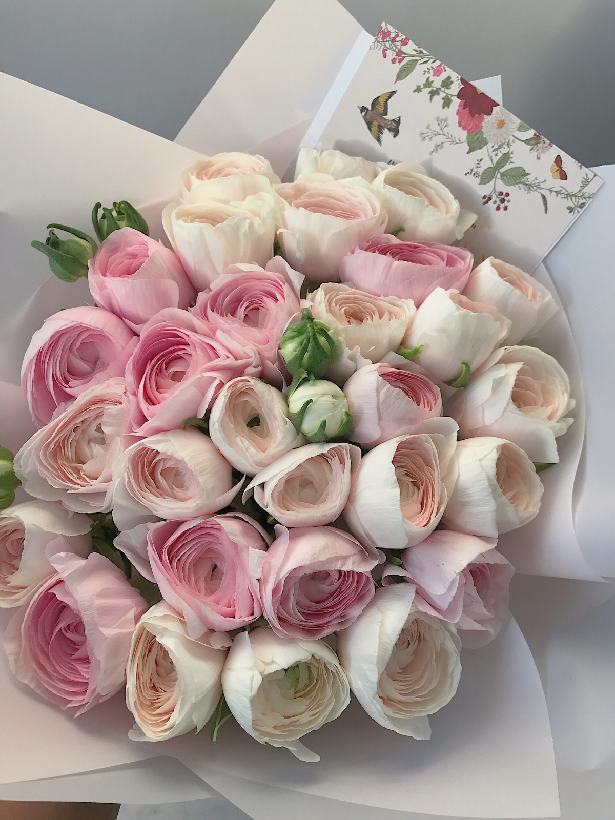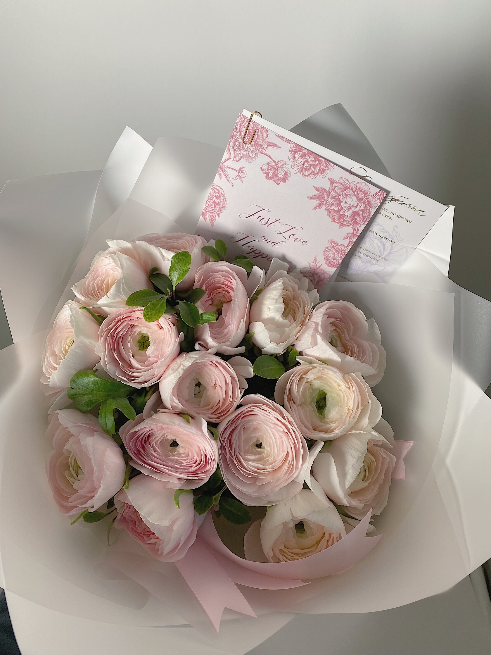 Часто для подарочных композиций выбирают нежные ранункулюсы - это цветы с округлыми бутонами из тонких невесомых лепестков.