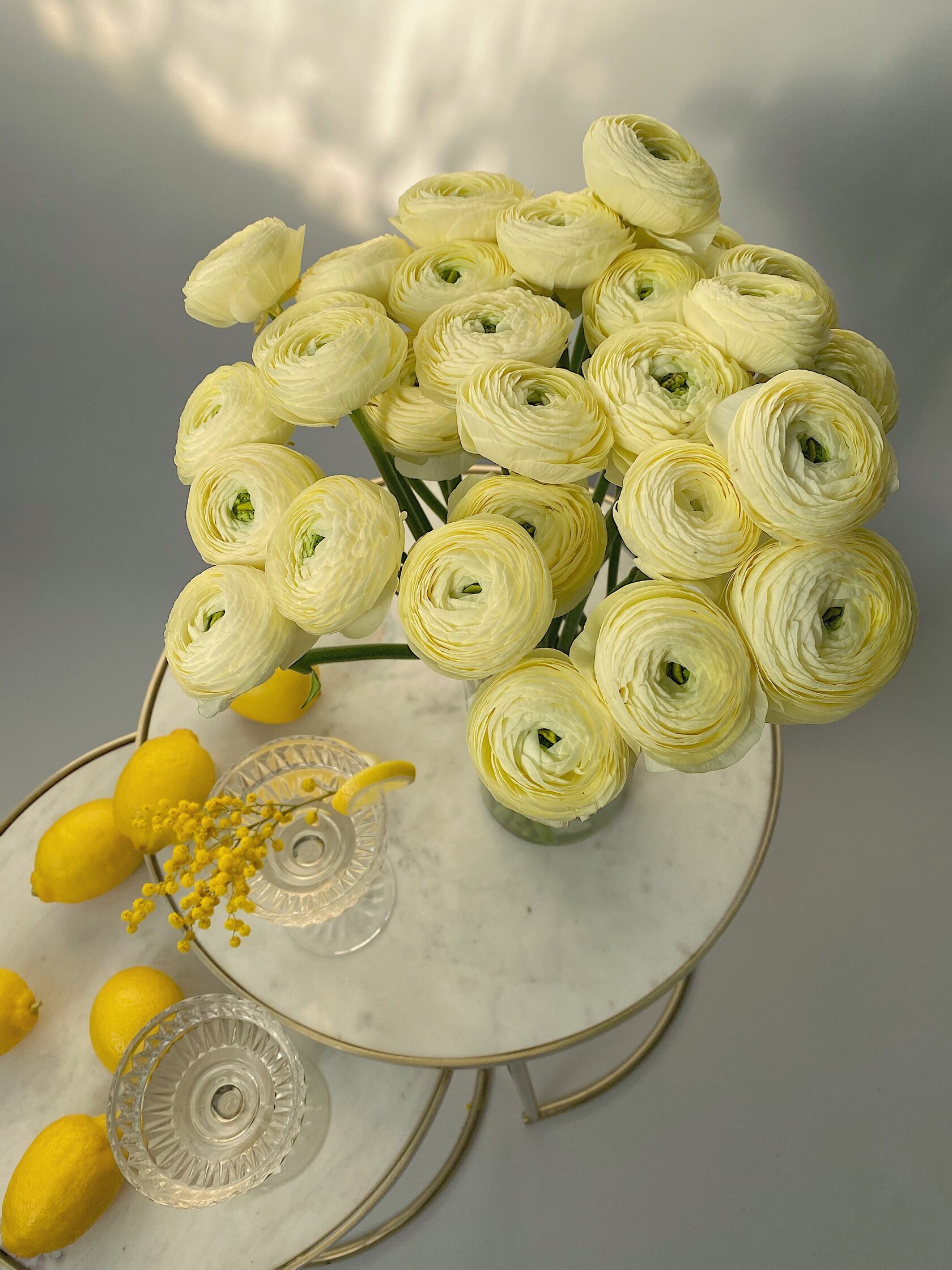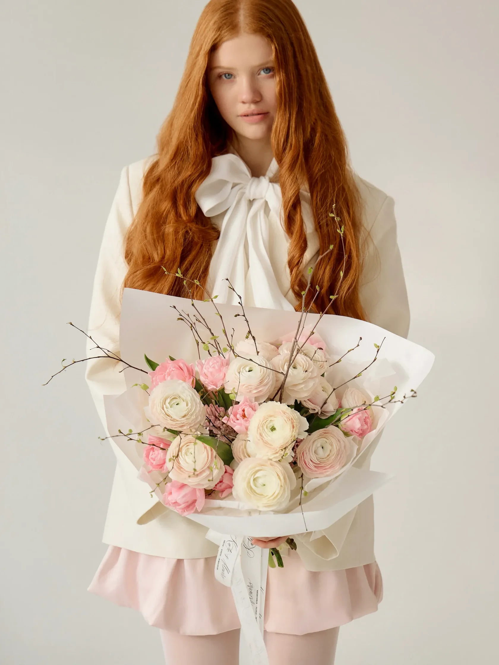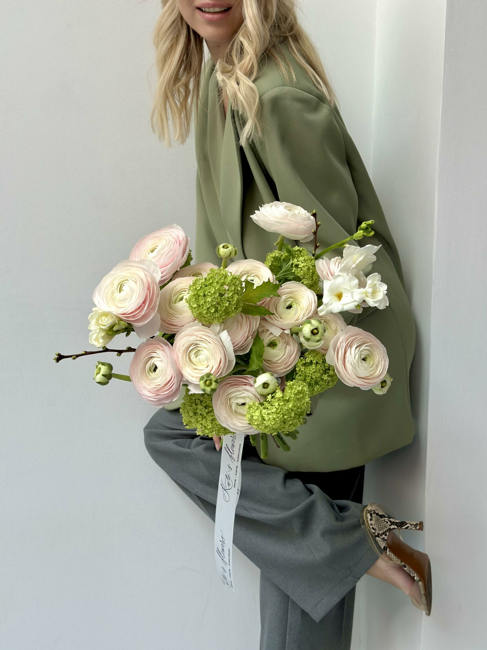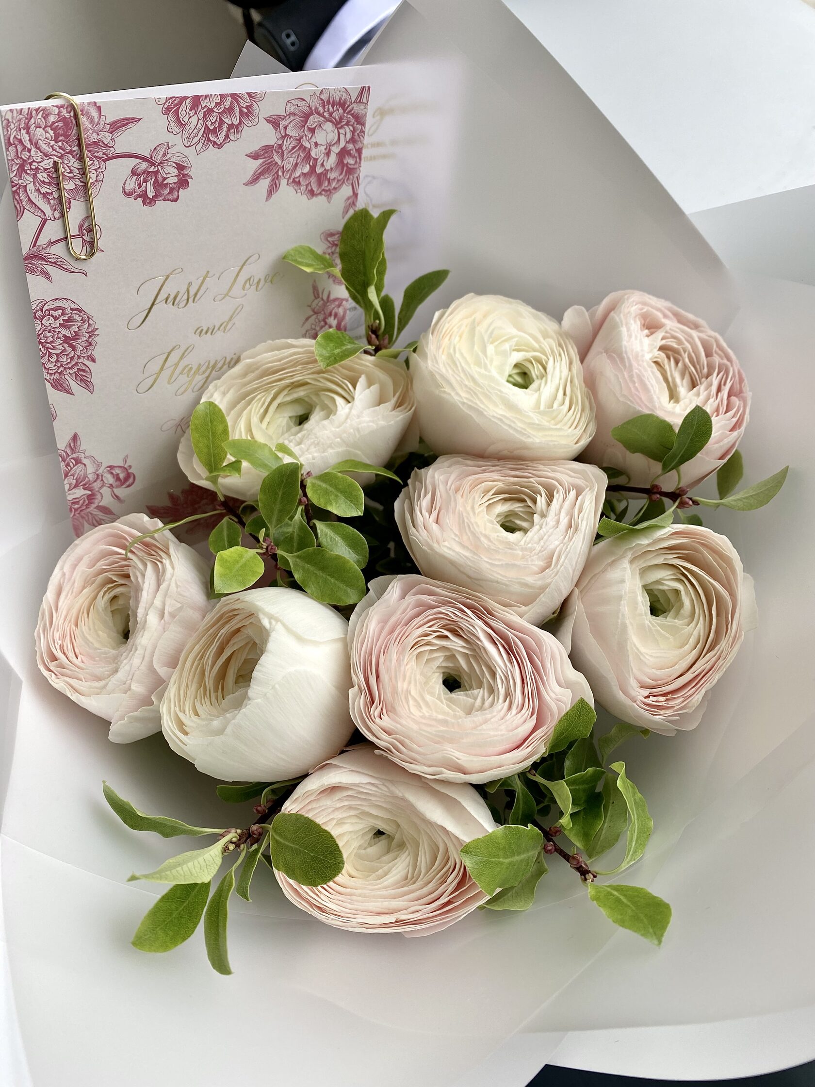 Часто для подарочных композиций выбирают нежные ранункулюсы - это цветы с округлыми бутонами из тонких невесомых лепестков.