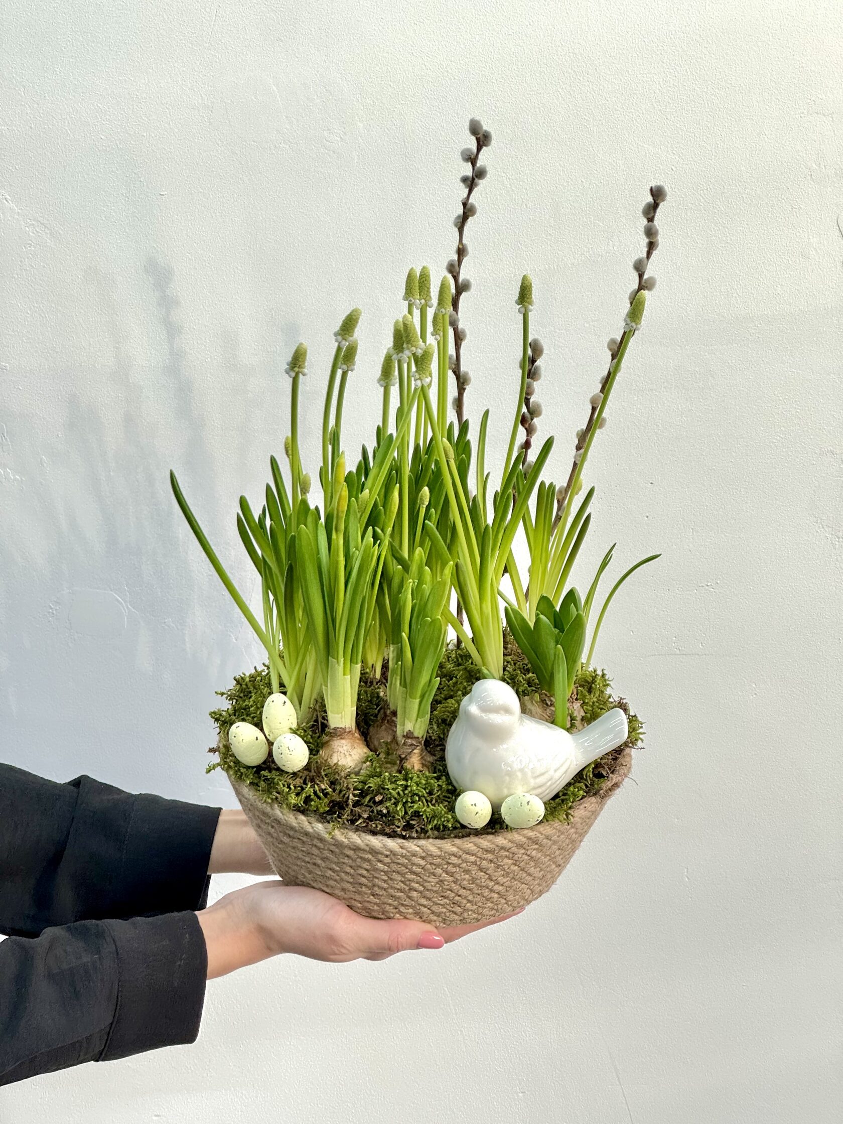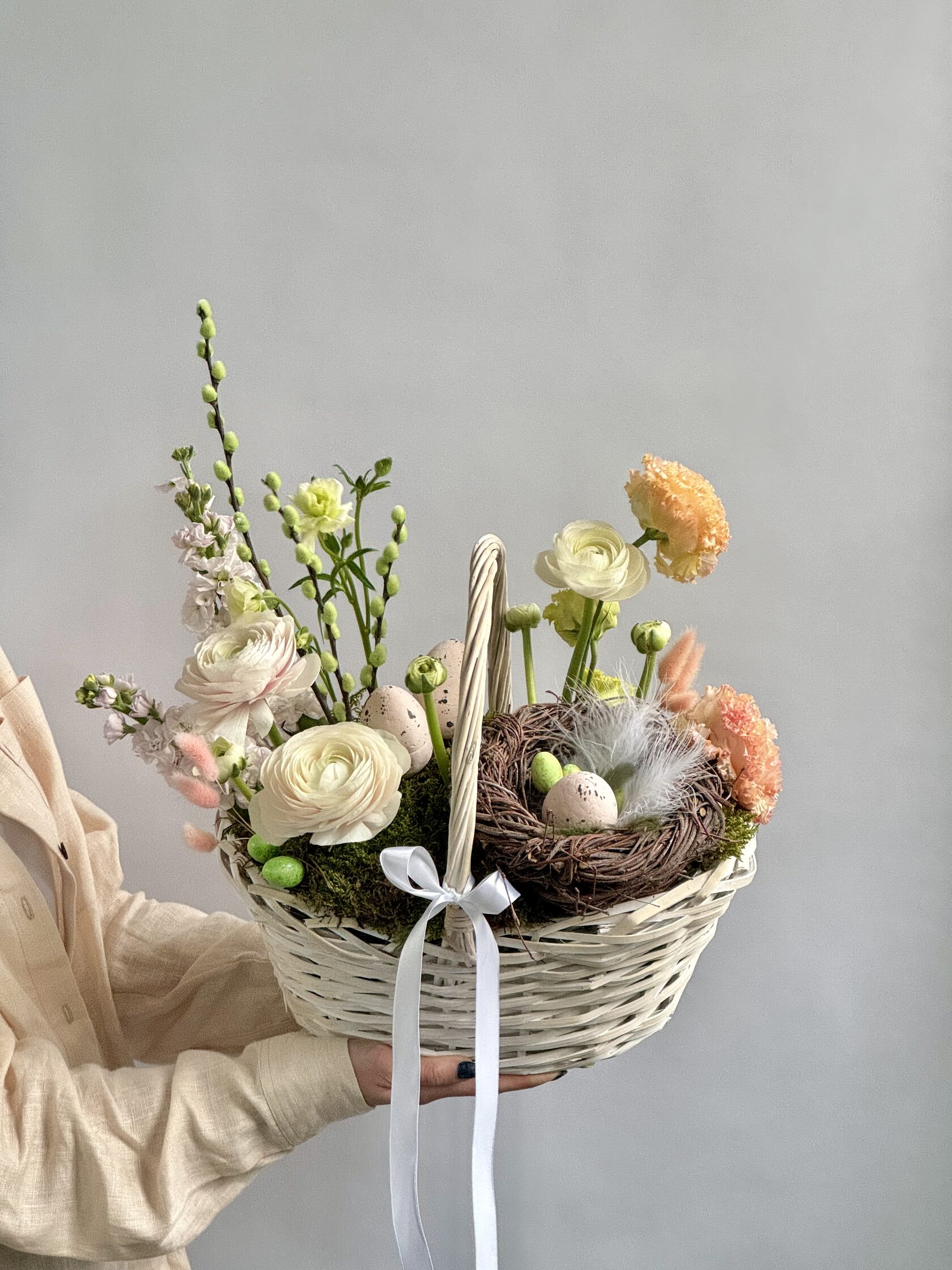 Как правило оформляют заказы на охапки цветов (монобукеты) под интерьерные вазы, но также мы составляем композиции из разных цветов с использованием пасхального декора.