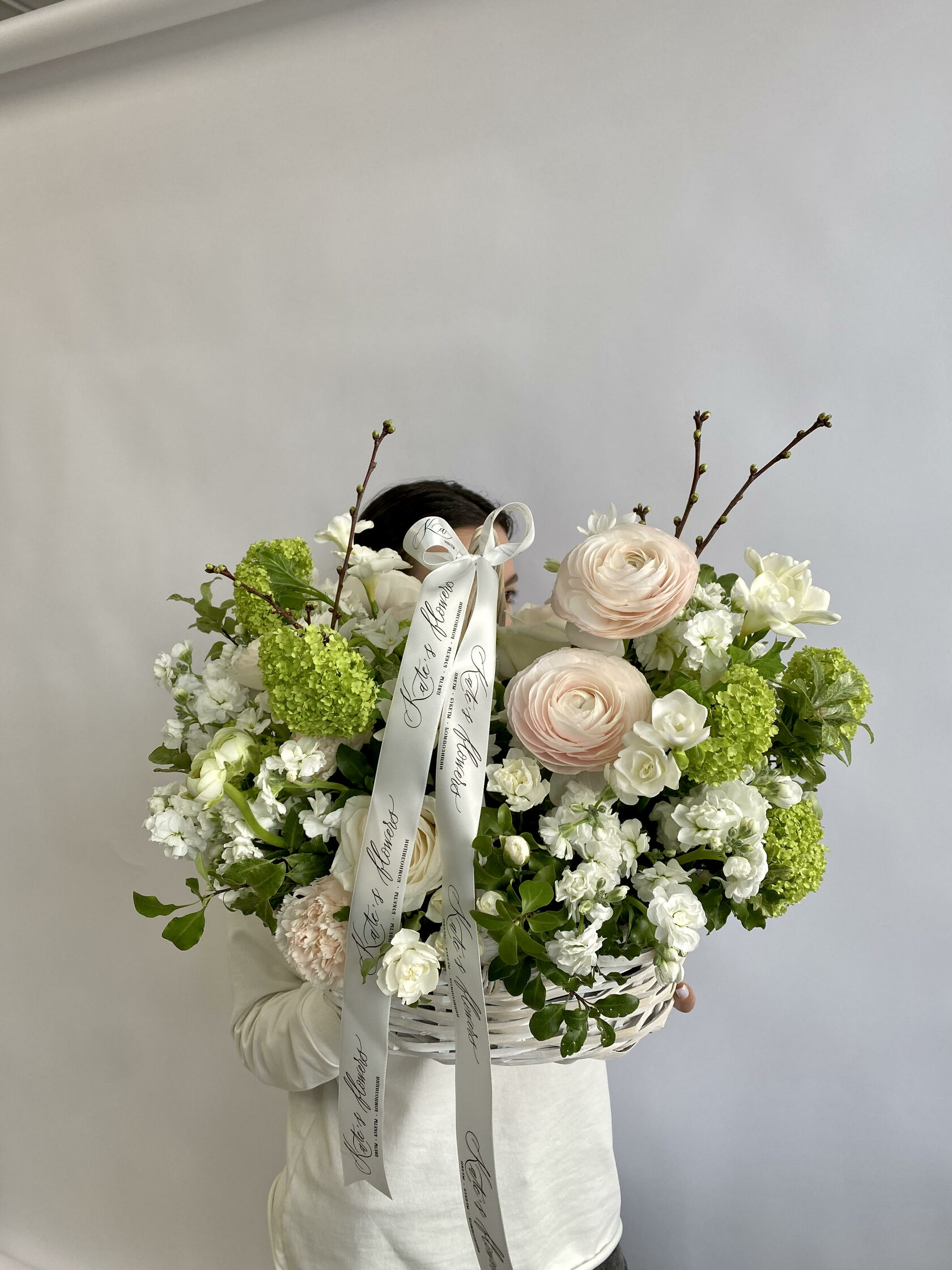 Часто для подарочных композиций выбирают нежные ранункулюсы - это цветы с округлыми бутонами из тонких невесомых лепестков.